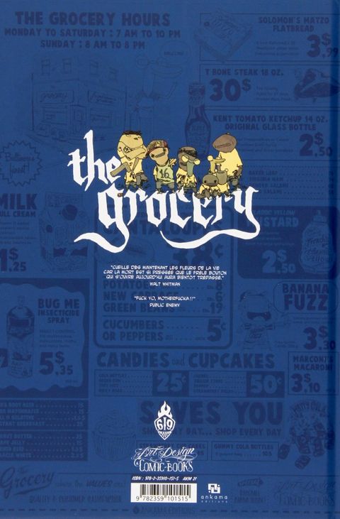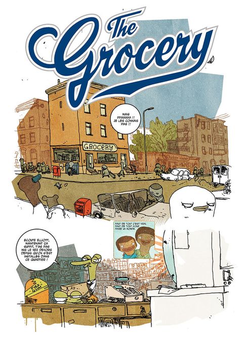 The Grocery est une chronique de rue relatant le quotidien de cornerboys de la ville de Baltimore. Sixteen et son gang de gamins dealer de dope, son ami d'enfance Elliot, fils de l'épicier et élève studieux, Washington, marine désespéré par son retour d'Irak, ou encore Ellisone, ancien caïd du quartier revenant prendre ses droits sur son territoire, sont autant de destins qui se croisent avec, pour point de convergence, l'épicerie de quartier de M.Friedman. L'expérience de photoreporter d'Aurélien Ducoudray et sa qualité de journaliste de presse confèrent au récit toute sa crédibilité. Avec un ton mature et rude, The Grocery présente un univers teinté de réalisme social, violent et cru, qui tranche avec le parti pris graphique, naïf et coloré, apporté par Guillaume Singelin. Rencontre improbable entre The Wire et Meet the Feebles, The Grocery, par sa singularité et son originalité, est la future série culte du Label 619.