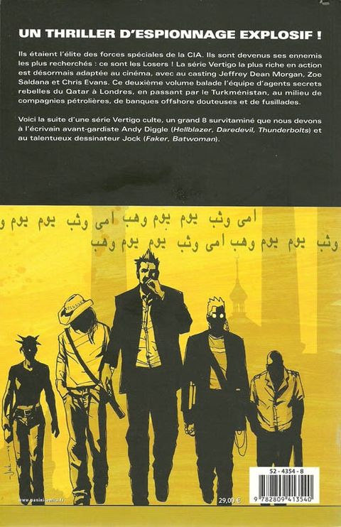Avant d'être un des films les plus attendus de l'année, The Losers est une série 100% espionnage concoctée par le duo Andy Diggle / Jock, dont le talent a été révélé avec ce titre. Ce deuxième tome consacré au commando renégat de la C.I.A. emmène les lecteurs du Qatar aux Açores en passant par le Turkménistan, dans une débauche d'action et d'aventures qui les cloueront dans leur fauteuil. Les secrets révélés ici pourraient bien faire trembler des nations entières.