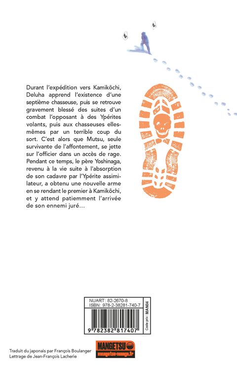 Durant l'expédition vers Kamikôchi, Deluha apprend l'existence d'une septième chasseuse, puis se retrouve gravement blessé des suites d'un combat l'opposant à des Ypérites volants, puis aux chasseuses elles-mêmes par un terrible coup du sort. C'est alors que Mutsu, seule survivante de l'affontement, se jette sur l'officier dans un accès de rage. Pendant ce temps, le père Yoshinaga, revenu à la vie suite à l'absorption de son cadavre par l'Ypérite assimilateur, a obtenu une nouvelle arme en se rendant le premier à Kamikôchi, et y attend patiemment l'arrivée de son ennemi juré...Découvrez la nouvelle série à succès de Maruei Rokudai révélée dans le magazine Shonen Jump!
