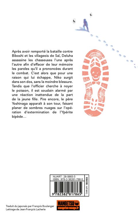 Après avoir remporté la bataille contre Biboshi et les villageois de Saï, Deluha assassine les chasseuses l'une après l'autre afin d'effacer de leur mémoire les paroles qu'il a prononcées durant le combat. C'est alors que pour une raison qui lui échappe, Niko surgit dans son dos, sans la moindre blessure. Tandis que l'officier cherche à noyer le poisson, il est soudain alarmé par une réaction inattendue de la part de la jeune fille. Pire encore, le père Yoshinaga apparaît à son tour, faisant planer de sombres nuages sur l'opération d'extermination de l'Ypérite bipède...Découvrez la nouvelle série à succès de Maruei Rokudai révélée dans le magazine Shonen Jump!