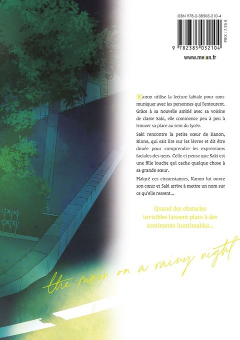 Kanon est sourde. Quelque chose chez elle attire Saki. Kanon utilise la lecture labiale pour communiquer avec les personnes qui l'entourent. Grâce à sa nouvelle amitié avec sa voisine de classe Saki, elle commence peu à peu à trouver sa place au sein du lycée. Saki rencontre la petite soeur de Kanon, Rinne, qui sait lire sur les lèvres et dit être douée pour comprendre les expressions faciales des gens. Celle-ci pense que Saki est une fille louche qui cache quelque chose à sa grande soeur. Malgré ces circonstances, Kanon lui ouvre son coeur et Saki arrive à mettre un nom sur ce qu'elle ressent... Comme la lune par une nuit pluvieuse, les deux jeunes filles possèdent quelque chose qui ne peut être vu avec les yeux.