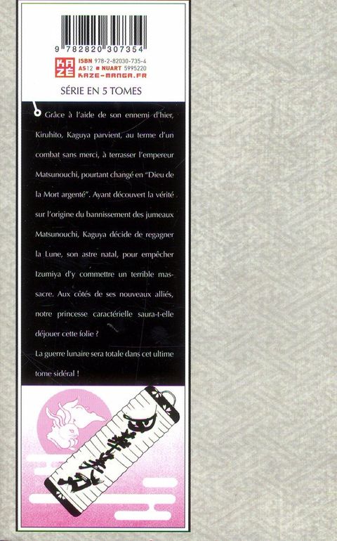 Grâce à l’aide de son ennemi d’hier, Kiruhito, Kaguya parvient, au terme d’un combat sans merci, à terrasser l’empereur Matsunouchi, pourtant changé en “Dieu de la Mort argenté”. Ayant découvert la vérité sur l’origine du bannissement des jumeaux Matsunouchi, Kaguya décide de regagner la Lune, son astre natal, pour empêcher Izumiya d’y commettre un terrible massacre. Aux côtés de ses nouveaux alliés, notre princesse caractérielle saura-t-elle déjouer cette folie ? La guerre lunaire sera totale dans cet ultime tome sidéral !