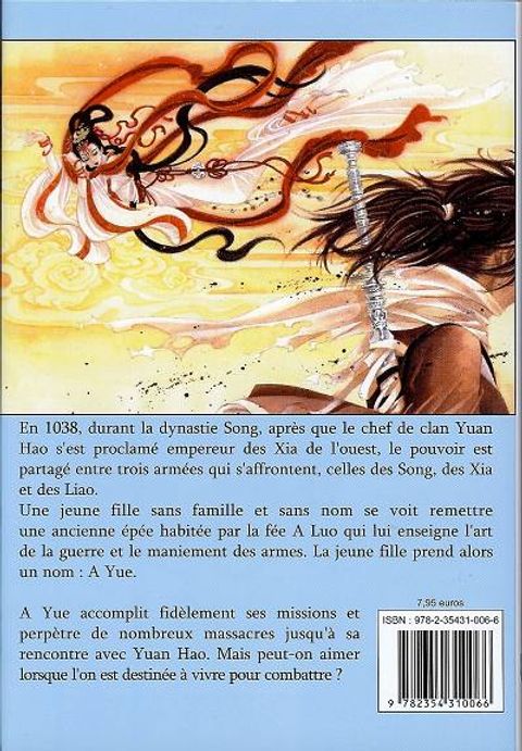 En 1038, durant la dynastie Song, après que le chef de clan Yuan Hao s'est proclammé empereur des Xia de l'Ouest, le pouvoir est partagé entre trois armées qui s'affrontent, celles des Song, des Xia et des Liao. Une jeune fille sans famille et sans nom se voit remettre une ancienne épée habitée par la fée A Luo qui lui enseigne l'art de la guerre er le maniement des armes. La jeune fille prend alors un nom: A Yue. A Yue accomplit fidèlement ses missions et perpètre de nombreux massacres jusqu'aà sa rencontre avec Yuan Hao. Mais peut-on aimer lorsque l'on est destinée à vivre pour combattre. The Moon mélange habilement combats au sabre, fantastique, éléments de shojo et contexte historique dans un style graphique flamboyant!