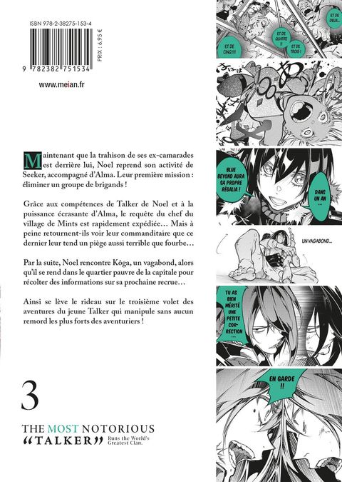 Découvrez le 3e volet des aventures du jeune Talker qui manipule les plus forts des aventuriers !Maintenant que la trahison de ses ex-camarades est derrière lui, Noel reprend son activité deSeeker, accompagné d'Alma. Leur première mission : éliminer un groupe de brigands !Grâce aux compétences de Talker de Noel et à la puissance écrasante d'Alma, le requête du chef du village de Mints est rapidement expédiée... Mais à peine retournent-ils voir leur commanditaire que ce dernier leur tend un piège aussi terrible que fourbe...Par la suite, Noel rencontre Kôga, un vagabond, alors qu'il se rend dans le quartier pauvre de la capitale pour récolter des informations sur sa prochaine recrue...