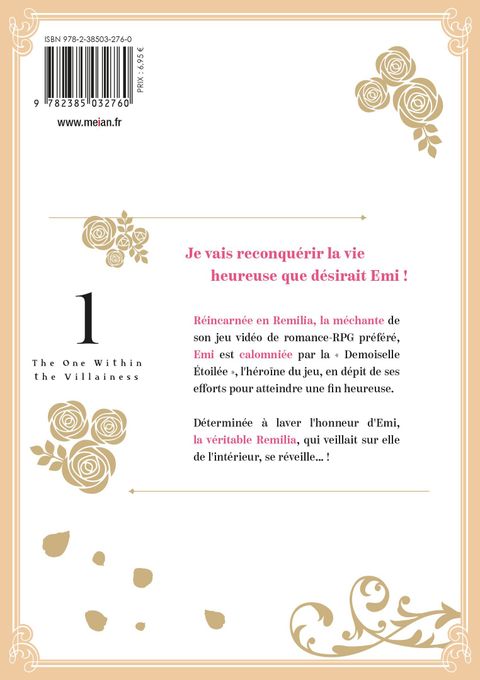 Je vais reconquérir la vie heureuse que désirait Emi !Réincarnée en Remilia, la méchante de son jeu vidéo de romance-RPG préféré, Emi est calomniée par la " Demoiselle Étoilée ", l'héroïne du jeu, en dépit de ses efforts pour atteindre une fin heureuse. Déterminée à laver l'honneur d'Emi, la véritable Remilia, qui veillait sur elle de l'intérieur, se réveille... !Je vous ferai payer ce que vous lui avez fait !Tout ça, je le fais pour celle que j'aime.La méchante prend le relai, bien décidée à se venger !