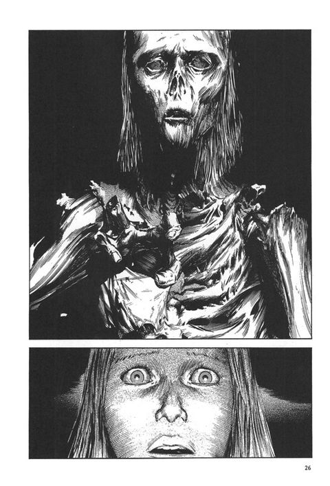 The Outsider, de H.P. Lovecraft, ouvre le bal de ce triptyque envoûtant avec le récit glaçant d’un individu prisonnier d’un bien étrange château… Suivent ensuite La maison à la mezzanine, de Chekhov et 26 men and a girl, de Gorki. Enfin, une sublime histoire de fantôme japonais, Ju-Ga, vient clore cette oeuvre à réserver aux amateurs de sueurs froides… Les amoureux de beau trait, ne désavoueront pas ce one-shot surprenant croisement entre culture occidentale et culture orientale.