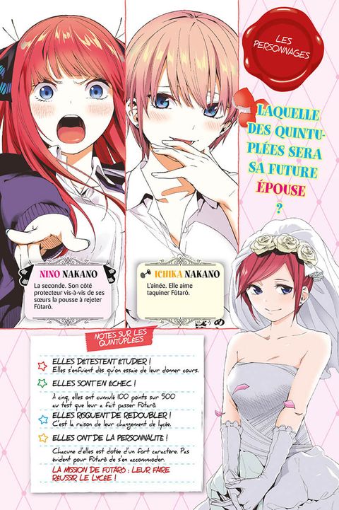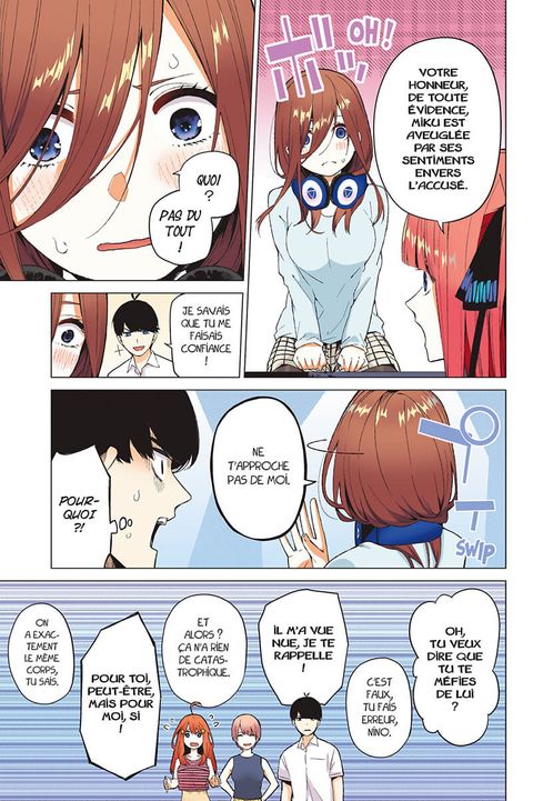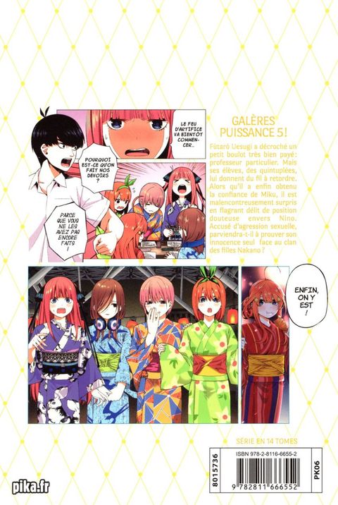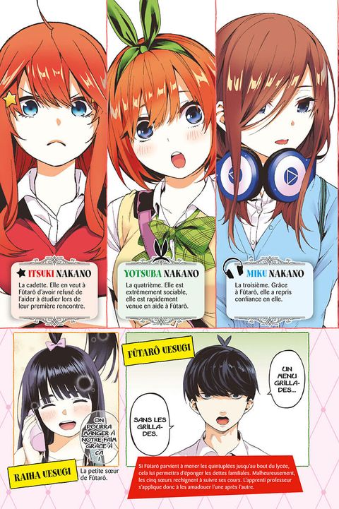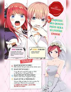 J'avoue être totalement accro aux quintuplées. Ce sont de vraies chipies, qui font tourner Uesugi en bourrique, mais elles n'ont pas mauvais fond. Il apprend doucement à les apprivoiser, même si certaines lui donnent du fil à retordre. Heureusement que l'adorable Yotsuba est là. Je les aime toutes, impossible de choisir (...) Voir le commentaire