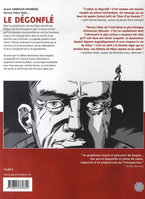 Avant "" american splendor "", harvey pekar était... "" le dégonflé ""... pour la première fois,harvey pekar raconte son enfance de fils d'émigrants juifs. à travers le récit de l'adolescence mouvementée du caïd de cleveland, jusqu'à son passage éclair dans la marine et ses premiers pas d'écrivain, ce superbe graphic novel relate l'histoire ordinaire d'un jeune homme qui se construit au fil de ses échecs, de ses rédemptions et de la complexité de la vie quotidienne. Illustrée par le célèbre dessinateur dean haspiel, "" le dégonflé "" est l'oeuvre la plus irrésistible et poignante de harvey pekar, un ouvrage inoubliable pour tous ceux qui, comme harvey, se sont battus, ont perdu et continuent de vivre jour après jour. ""la vie ordinaire est une chose très compliquée"", remarque harvey pekar qui écrit sur le sujet depuis 1976, dans sa série autobiographique "" american splendor "" couronnée par un american book award. Mais pour harvey, il y a encore plus compliqué que la vie : c'est de grandir. dans ce graphic novel émouvant, il raconte l'histoire d'un gamin qui laisse tomber tout ce qu'il tente. révélant une facette que même cet auteur qui se dévoile sans concession n'avait jamais avouée, pekar affronte son passé de petite frappe qui cognait sur tous ceux qui le regardaient de travers, juste pour épater la galerie. Et quand il ne réussissait pas à se faire remarquer, que ce soit sur un terrain de football, en cours de maths, dans la marine ou au travail, il renonçait tout simplement."" le dégonflé "" raconte comment il a appris à s'en sortir, même si cela n'a pas été facile. transcendé par le graphisme prenant et incisif du génial dessinateur indépendant dean haspiel, "" le dégonflé "" est le chef-d'oeuvre de harvey pekar.