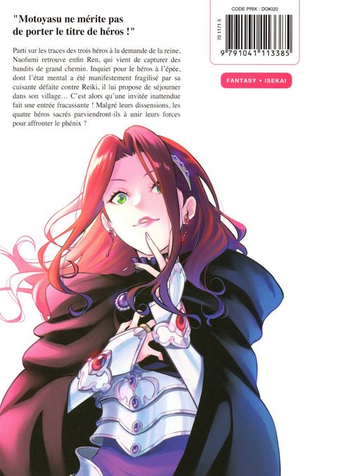 <div>"Motoyasu ne mérite pas de porter le titre de héros !"</div><div>Parti sur les traces des trois héros à la demande de la reine, Naofumi retrouve enfin Ren, qui vient de capturer des bandits de grand chemin. Inquiet pour le héros à l'épée, dont l'état mental a été manifestement fragilisé par sa cuisante défaite contre Reiki, il lui propose de séjourner dans son village... C'est alors qu'une invitée inattendue fait une entrée fracassante ! Malgré leurs dissensions, les quatre héros sacrés parviendront-ils à unir leurs forces pour affronter le phénix ?</div>