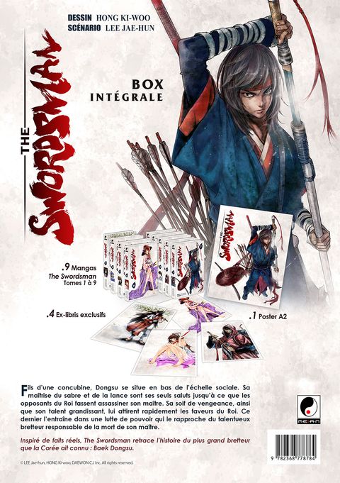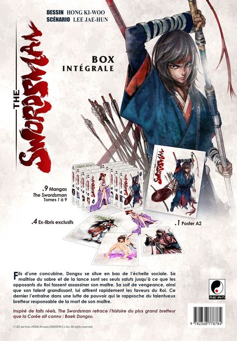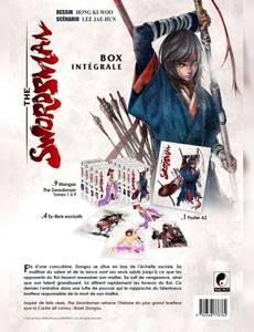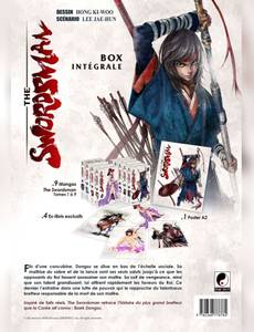 Fils d'une concubine, Dongsu se situe en bas de l'échelle sociale. Samaîtrise du sabre et de la lance sont ses seuls saluts jusqu'à ce que les opposants du Roi fassent assassiner son maître. Sa soif de vengeance, ainsi que son talent grandissant, lui attirent rapidement les faveurs du Roi. Ce dernier l'entraîne alors dans une lutte de pouvoir qui le rapproche du talentueux bretteur responsable de la mort de son maître. Inspiré de faits réels, The Swordsman retrace l'histoire du plus grand bretteur que la Corée ait connu : Baek Dongsu. Ce coffret collector à tirage limité contient : - Les 9 tomes de la série (vol.1 à 9 - 1644 pages). - 4 Ex-libris exclusifs. - 1 Poster A2 inédit.