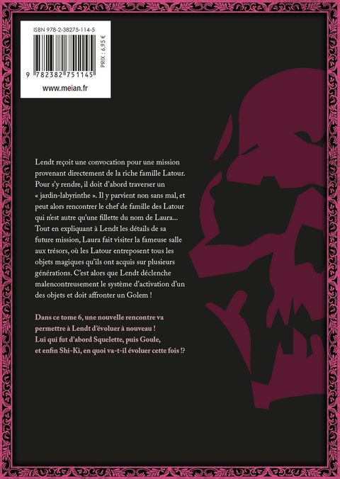 Lendt reçoit une convocation pour une mission provenant directement de la riche famille Latour. Pour s'y rendre, il doit d'abord traverser un " jardin-labyrinthe ". Il y parvient non sans mal, et peut alors rencontrer le chef de famille des Latour qui n'est autre qu'une fillette du nom de Laura... Tout en expliquant à Lendt les détails de sa future mission, Laura fait visiter la fameuse salle aux trésors, où les Latour entreposent tous les objets magiques qu'ils ont acquis sur plusieurs générations. C'est alors que Lendt déclenche malencontreusement le système d'activation d'un des objets et doit affronter un Golem ! Dans ce tome 6, une nouvelle rencontre va permettre à Lendt d'évoluer à nouveau ! Lui qui fut d'abord Squelette, puis Goule, et enfin Shi-Ki, en quoi va-t-il évoluer cette fois !?