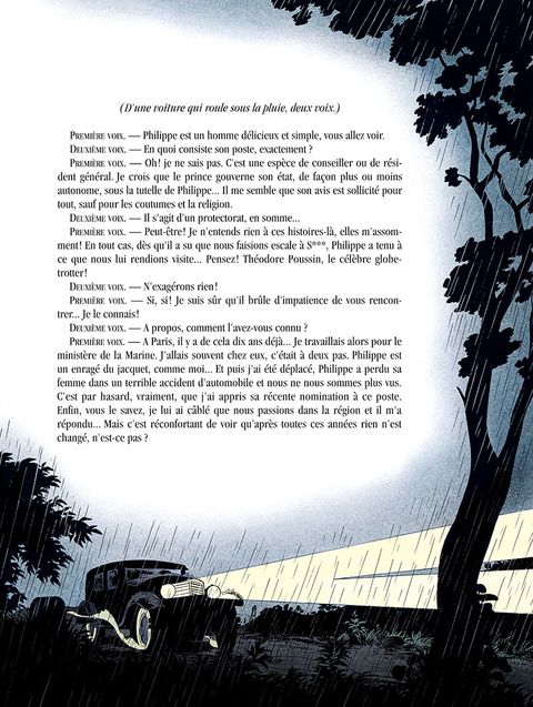 Au palais du prince Amsad, dans le contexte colonial des années 1930, Théodore Poussin enquête sur la corruption à la cour de cet État princier, un nid d'espions, théâtre du pouvoir et de l'amour. Le célèbre globetrotteur pourra-t-il démêler quiproquos et faux-semblants de cette inextricable affaire ? Sur fond de chasse au tigre, de rendez-vous galants et de complots ourdis dans les souterrains, les apparences sont trompeuses et Frank Le Gall excelle à jongler avec les malentendus pour tisser cette aventure au long cours.