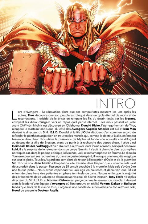 Ceux qui l'avaient parié ont gagné ! Le film Thor a embrasé les salles obscures en avril dernier. La première expérience cinématographique du Dieu du Tonnerre a été un énorme succès. Côté librairie, le premier volume paru dans la collection DELUXE, a lui aussi suscité un véritable engouement. Le deuxième tome est donc très attendu. Il nous présente la suite et la fin de la savoureuse saga de J.M. Straczynski et Olivier Coipel, dans laquelle Loki nous dévoile ses plans. Nous découvrirons aussi ce que vient faire Bor, le grand-père de Thor et nous comprendrons le rôle que va jouer le terrible Docteur Fatalis. En décembre, Thor retombera entre les mains expertes d'Olivier Coipel dans la série publiée en kiosque, il sera aussi le principal protagoniste de Fear Itself, le dernier crossover Marvel. Le Dieu du Tonnerre n'a pas fini de faire parler de lui !