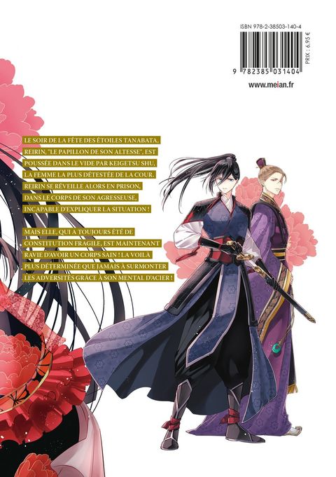 Manigances à la cour !La princesse Reirin, favorite du palais, échange de corps avec la plus détestée des apprenties ?!Le soir de la fête des étoiles Tanabata, Reirin, "le papillon de Son Altesse", est poussée dans le vide par Keigetsu Shu, la femme la plus détestée de la cour. Reirin se réveille alors en prison, dans le corps de son agresseuse, incapable d'expliquer la situation ! Mais elle, qui a toujours été de constitution fragile, est maintenant ravie d'avoir un corps sain ! La voilàplus déterminée que jamais à surmonter les adversités grâce à son mental d'acier !Le manga tiré du light novel à succès !En réimpression continue.Le grand drame d'inversion de corps se déroulant dans un palais chinois !Reirin a changé de corps avec la maléfique Keigetsu.Accusée d'avoir attenté à sa propre vie, elle est exilée dans une cabane délabrée...Mais c'est en fait la liberté dont elle a toujours rêvé ?!