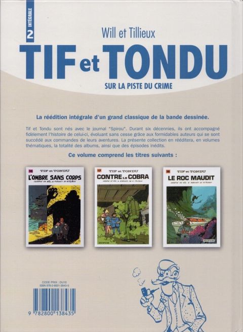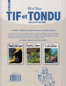 Dans la nuit, une voiture sans conducteur s'arrête devant un cottage. Une portière s'ouvre et se referme, toute seule. Des herbes s'affaissent, comme foulées par de monstrueux pieds invisibles... Et puis, tout s'accélère! Une vitre se brise. Un homme est soulevé de terre et projeté contre le mur. Un message menaçant s'inscrit sur la paroi: "Fischusset, tes jours sont comptés. John Fullshoke". Fischusset, c'est le nom d'un inspecteur anglais, un vieil ami de Tif et Tondu. Un mois plus tôt, il avait abattu celui qui signe ce message, un dangereux criminel qui semble revenu du néant pour se venger. Lutter contre un fantôme, ce n'est déjà pas rien. Mais d'autres mystères, encore plus inquiétants, attendent Tif et Tondu. Dans un château isolé, un homme à tête de serpent vient, la nuit, menacer une jeune et jolie comtesse. Et dans un vieux phare de Normandie, en pleine mer, les gardiens sont retrouvés pendus, les uns après les autres. Tout autre que Tif et Tondu aurait succombé à la panique et aurait pris ses jambes à son cou devant ces manifestations de forces diaboliques qui les dépassent. Mais nos deux aventuriers ne se laissent pas démonter aussi facilement... surtout quand un ami ou une jolie femme est en danger ! Le second volume de l'intégrale comprend "L'ombre sans corps", "Tif et Tondu contre le Cobra", "Le Roc maudit". Trois aventures dont l'ambiance particulièrement oppressante marque l'arrivée d'un immense scénariste aux commandes de la série, un maître du "thriller", Maurice Tillieux. En reprenant "Tif et Tondu" en 1968, il va l'orienter vers des enquêtes beaucoup plus angoissantes, et transformera le duo en trio en amenant la jolie comtesse Amélie d'Yeu, alias Kiki.