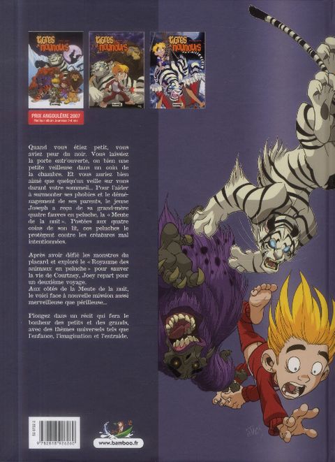 Quand vous étiez petit, vous aviez peur du noir. Vous laissiez une petite veilleuse dans un coin de la chambre. Et vous auriez bien aimé que quelqu'un veille sur vous durant votre sommeil. Un protecteur, un gardien, dont l'autorité et la puissance chasseraient les monstres qui rôdent dans la pénombre... Afin qu'il n'ait plus peur du noir, la grand-mère du jeune Joseph lui a offert quatre fauves en peluche, qu'il dispose aux quatre coins de son lit, afin qu'ils le protègent des créatures mal intentionnées. Depuis, Joseph dort profondément, la nuit. Les fauves veillent... Car le danger est toujours là, tapi dans le cagibi, de l'autre côté de sa chambre...