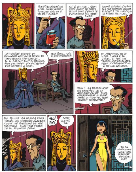 Entamé dans "L'Art du cinquième bonheur", le périple d'Alix Yin Fu à San Francisco se poursuit, mettant sa morale à bien rude épreuve. Quelle idée aussi de refuser que l'agent Yi Zi soit exécutée sous prétexte qu'elle n'a rien fait de mal ! Ses états d'âme de "petite-bourgeoise" provoquent la colère de Kan Sheng qui l'envoie illico sur le front pour qu'elle se rachète une âme d'agent communiste digne de ce nom. Sa nouvelle mission : séduire le ministre des Finances de Tchang Kaï-Chek... Pour cela, elle doit connaître les 99 points de pression suprêmes sur le bout des doigts. Si 63 d'entre eux provoquent un plaisir extrême, les 36 autres suscitent en revanche une douleur sublime... "Tigresse blanche", série rocambolesque et décapante, c'est un gros coup de chaleur en pleine guerre froide !