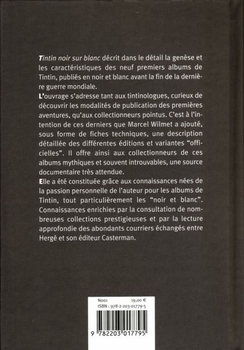 Tintin noir sur blanc retrace les circonstances et les modalités de la création des AVENTURES DE TINTIN EN NOIR ET BLANC. Du Soviets au Crabe, les neufs titres sont étudiés dans leurs différentes éditions successives, tant sur le plan éditorial que sur le plan technique, jusqu'aux erreurs et curiosités de chaque tirage. Marcel Wilmet a eu sous les yeux un très grand nombre d'albums de collectionneurs en plus de ceux des bibliothèques de la Fondation Hergé et des éditions Casterman. Il a analysé les comptes d'auteur et les centaines de lettres échangées par Hergé et son éditeur, mettant ainsi au jour une foule d'informations inédites.