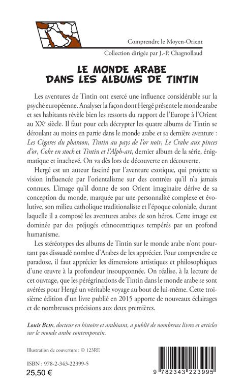 Les aventures de Tintin ont exercé une influence considérable sur la psyché européenne. Analyser la façon dont Hergé présente le monde arabe et ses habitants révèle bien les ressorts du rapport de l'Europe à l'Orient au XXe siècle. Il faut pour cela décrypter les quatre albums de Tintin se déroulant au moins en partie dans le monde arabe et sa dernière aventure : Les Cigares du pharaon, Tintin au pays de l'or noir, Le Crabe aux pinces d'or, Coke en stock et Tintin et l'Alph-art, dernier album de la série, énigmatique et inachevé. On va dès lors de découverte en découverte. Hergé est un auteur fasciné par l'aventure exotique, qui projette sa vision influencée par l'orientalisme sur des contrées qu'il n'a jamais connues. L'image qu'il donne de son Orient imaginaire dérive de sa conception du monde, marquée par une personnalité complexe et évolutive, son milieu catholique traditionaliste et l'époque coloniale, durant laquelle il a composé les aventures arabes de son héros. Cette image est dominée par des préjugés ethnocentriques tempérés par un profond humanisme. Les stéréotypes des albums de Tintin sur le monde arabe dont pourtant pas dissuadé nombre d'Arabes de les apprécier. Pour comprendre ce paradoxe, il faut apprécier les dimensions artistiques et philosophiques d'une oeuvre à la profondeur insoupçonnée. On réalise, à la lecture de cet ouvrage, que les pérégrinations de Tintin dans le monde arabe se sont avérées pour Hergé un véritable voyage au bout de lui-même. Cette troisième édition d'un livre publié en 2015 apporte de nouveaux éclairages et de nombreuses précisions aux deux premières.