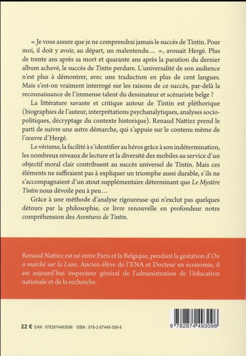 « Je vous assure que je ne comprendrai jamais le succès de Tintin. Pour moi, il doit y avoir, au départ, un malentendu. », avouait Hergé. Plus de trente ans après sa mort, le succès de Tintin perdure. L'universalité de son audience n'est plus à démontrer, avec une traduction en plus de cent langues. Mais s'est-on vraiment interrogé sur les raisons de ce succès, par-delà la reconnaissance de l'immense talent du dessinateur et scénariste belge ? La littérature savante et critique autour de Tintin est pléthorique (biographies de l'auteur, interprétations psychanalytiques, analyses socio-politiques, décryptage du contexte historique). Renaud Nattiez prend le parti de suivre une autre démarche, qui s'appuie sur le contenu même de l'oeuvre d'Hergé.