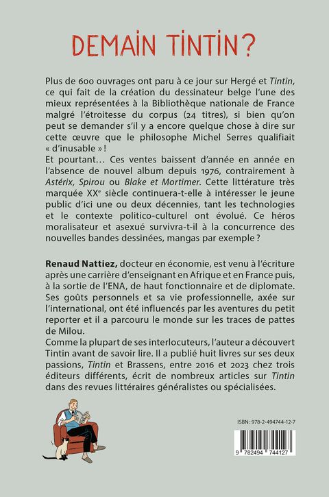 Plus de 600 ouvrages ont paru à ce jour sur Hergé et Tintin, ce qui fait de la création du dessinateur belge l’une des mieux représentées à la BNF malgré l’étroitesse du corpus, si bien qu’on peut se demander s’il y a encore quelque chose à dire sur cette oeuvre que le philosophe Michel Serres qualifiait « d’inusable » !Et pourtant… Les ventes baissent d’année en année en l’absence de nouvel album depuis 1976, contrairement à Astérix, Spirou ou Blake et Mortimer. Cette littérature très marquée XXe siècle continuera-t-elle à intéresser le jeune public d’ici une ou deux décennies, tant les technologies et le contexte politico-culturel ont évolué ? Ce héros moralisateur et asexué survivra-t-il à la concurrence des nouvelles bandes dessinées ?Peut-on croire en la pérennité ou même simplement en un avenir à court ou moyen terme pour ce petit reporter trop lisse issu d’un univers désuet et sans femmes, et quels sont les moyens pour y parvenir ? Ce sont quelques-unes des questions posées par Renaud Nattiez à sept des meilleurs connaisseurs actuels de Tintin dont les plus grands biographes, certains ayant fréquenté Hergé : Albert Algoud, Jean-Marie Apostolidès, Pierre Assouline, Philippe Goddin, Jacques Langlois, Benoît Peeters et Numa Sadoul. Recueillir leur témoignage aura été une façon indirecte d’échanger avec le « Maître », Georges Remi, que Renaud Nattiez n’a jamais eu l’heur de rencontrer !