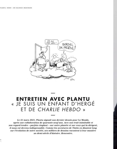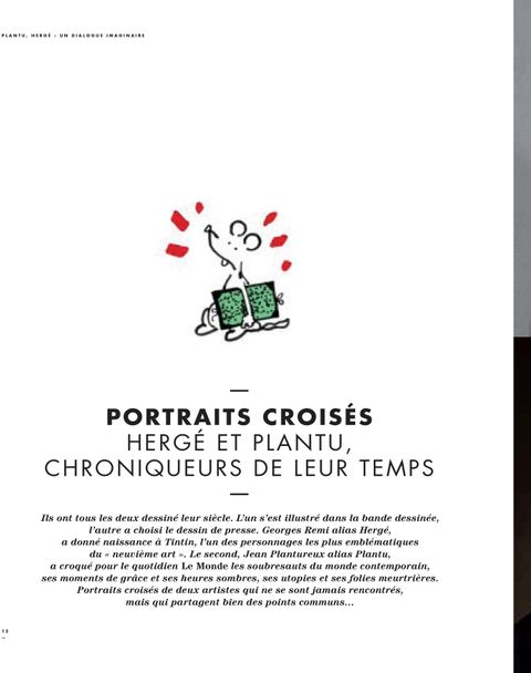 Plantu nous invite à redécouvrir Tintin, grâce au regard qu'il pose sur l'œuvre d'Hergé comme sur le monde. Hergé, Plantu, deux artistes aux multiples talents, deux chroniqueurs de leur temps, deux œuvres dessinées incontournables. Le premier, après s'être frotté au dessin de presse, a laissé éclater son génie dans les nombreuses aventures de Tintin, entre autres. Le second, après une tentative vers la bande-dessinée, a imposé son regard acéré et son trait malicieux au fil des décennies, plus particulièrement en Une du prestigieux journal Le Monde durant cinquante ans. Ce hors-série invite ces deux esprits à dialoguer, par-delà les époques, et alors qu'ils ne se sont jamais rencontrés. L'influence, parfois inconsciente, qu'a eu Hergé sur Plantu, visibles dans les nombreux hommages dessinés de ce dernier, leurs thématiques communes, leur ouverture sur le monde et leur esprit explorateur, leurs compagnons animaliers, l'un un chien, l'autre une souris, sont autant de passerelles que cet ouvrage propose, invitant ainsi à (re)découvrir deux univers foisonnants.