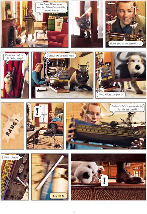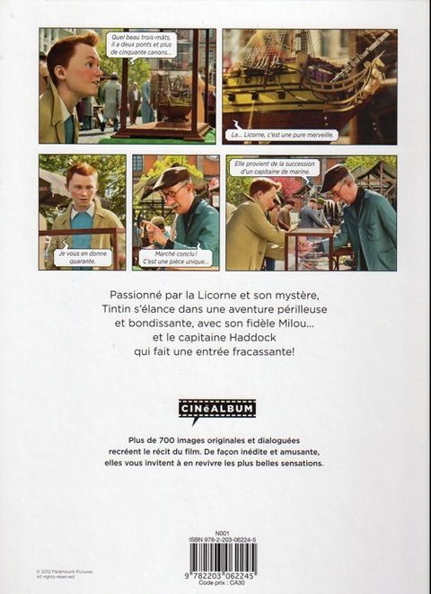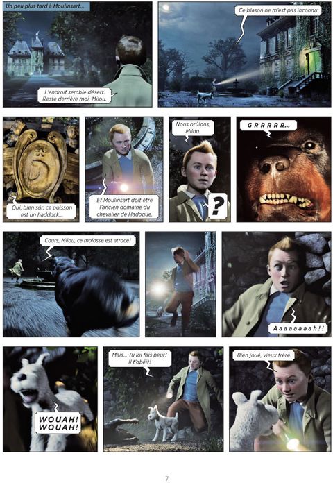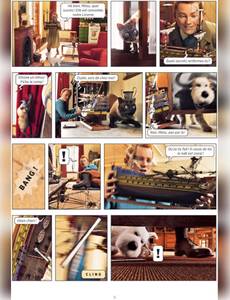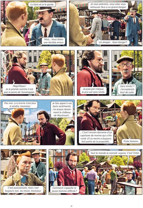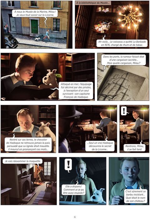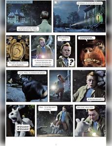 Case après case nous découvrons les images du film de Steven Spielberg : du marché aux puces à Moulinsart, en passant par l'enlèvement de Tintin, sa captivité sur le Karaboudjan, la rencontre avec la capitaine Haddock, l'épopée en canot,...