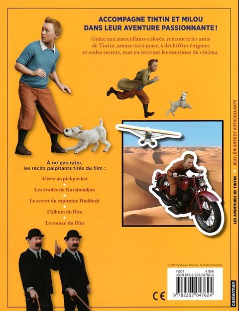 Grâce à des autocollants colorés, les plus petits sont invités à déchiffrer des énigmes, mener une véritable chasse au trésor, traduire des codes secrets,… tout en revivant les émotions vécues au cinéma. Plus de 100 autocollants repositionnables, tout en couleurs ! Images et autocollants tirés du film de Steven Spielberg (Paramount Pictures 2011). Adaptation française : Millefeuilles. Plus de 100 autocollants repositionnables, tout en couleurs !
