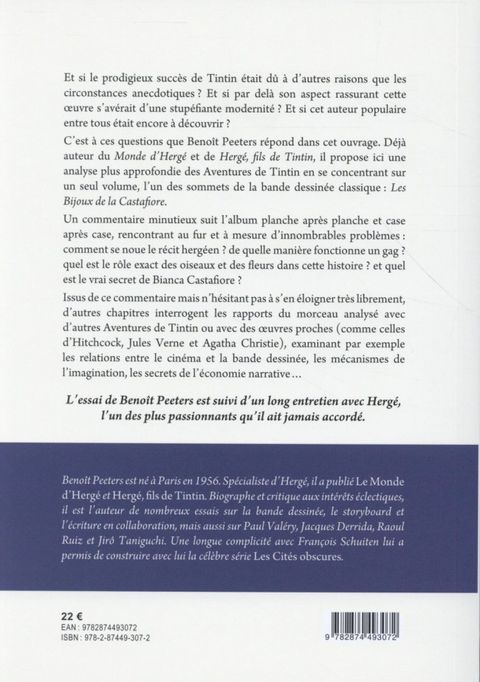 Et si le prodigieux succès de tintin était dû à d'autres raisons que les circonstances anecdotiques ? et si par delà son aspect rassurant cette oeuvre s'avérait d'une stupéfiante modernité ? et si cet auteur populaire entre tous était encore à découvrir ? c'est à ces questions que benoît peeters répond dans cet ouvrage. Déjà auteur du monde d'hergé et de hergé, fils de tintin, il propose ici une analyse plus approfondie des aventures de tintin en se concentrant sur un seul volume, l'un des sommets de la bande dessinée classique : les bijoux de la castafiore. un commentaire minutieux suit l'album planche après planche et case après case, rencontrant au fur et à mesure d'innombrable problèmes : comment se noue le récit hergéen ? de quelle manière fonctionne un gag ? quel est le rôle exact des oiseaux et des fleurs dans cette histoire ? et quel est le vrai secret de bianca castafiore ? issus de ce commentaire mais n'hésitant pas à s'en éloigner très librement, d'autres chapitres interrogeront les rapports du morceau analysé avec d'autres aventures de tintin ou avec des oeuvres proches (celles notamment d'hitchcock, de jules verne ou d'agatha christie), examinant par exemple les relations entre le cinéma et la bande dessinée, les mécanismes de l'imagination, les secrets de l'économie narrative. L'essai de benoît peeters est suivi d'un long entretien avec hergé, l'un des plus passionnants qu'il ait jamais accordé.