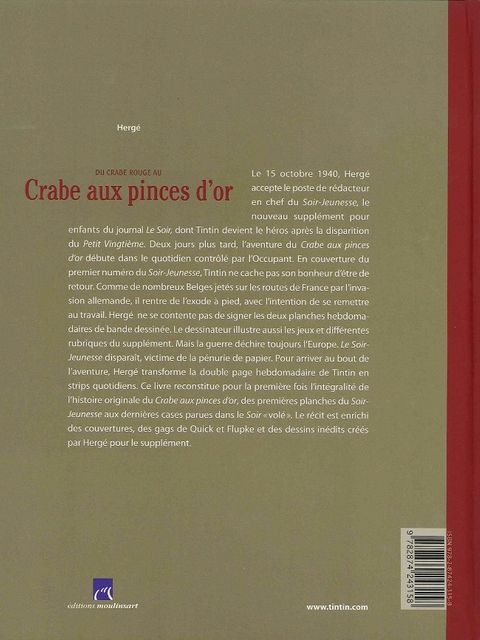 Le 15 octobre 1940, Hergé accepte le poste de rédacteur en chef du Soir-Jeunesse, le nouveau supplément pour enfants du journal Le Soir, dont Tintin devient le héros après la disparition du Petit Vingtième. Deux jours plus tard, l'aventure du Crabe aux pinces d'or débute dans le quotidien contrôlé par l'Occupant. En couverture du premier numéro du Soir-Jeunesse, Tintin ne cache pas son bonheur d'être de retour. Comme de nombreux Belges jetés sur les routes de France par l'invasion allemande, il rentre de l'exode à pied, avec l'intention de se remettre au travail. Hergé ne se contente pas de signer les deux planches hebdomadaires de bande dessinée. Le dessinateur illustre aussi les jeux et différentes rubriques du supplément. Mais la guerre déchire toujours l'Europe. Le Soir-Jeunesse disparaît, victime de la pénurie de papier. Pour arriver au bout de l'aventure, Hergé transforme la double page hebdomadaire de Tintin en strips quotidiens. Ce livre reconstitue pour la première fois l'intégralité de l'histoire originale du Crabe aux pinces d'or, des premières planches du Soir-Jeunesse aux dernières cases parues dans Le Soir « volé ». Le récit est enrichi des couvertures, des gags de Quick et Flupke et des dessins inédits créés par Hergé pour le supplément.