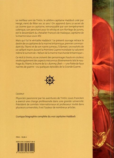 Le célèbre capitaine Haddock, le meilleur ami de Tintin, personnage créé par Hergé, vient de fêter ses 70 ans ! Nous apprenons dans Le secret de La Licorne que ce capitaine remarquable par son tempérament colérique, son penchant pour le whisky et son florilège de jurons est le descendant du Chevalier François de Hadoque, capitaine de la marine sous Louis XIV. Mais qui fut le véritable Haddock ? Le livre retrace le destin de ce capitaine de la marine britannique, premier commandant du Titanic et de son navire jumeau, l'Olympic. Ce récit à tiroirs, où se rencontrent des personnages hauts en couleurs, révèle également des aspects méconnus d'évènements tels le naufrage du Titanic, la « dummy fleet », une fausse flotte de navires de combat, ou la Grande Guerre.