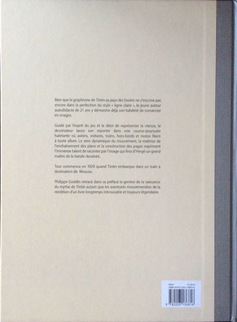 La première aventure de Tintin en couleurs. Tintin au pays des Soviets reste le seul album de Tintin uniquement disponible à ce jour dans sa version noir et blanc. Créée en 1929 et restée introuvable en librairie jusqu'en 1973, cette première grande histoire marque la naissance de Tintin. C'est avec un plaisir presque enfantin, guidé par l'esprit du jeu et le désir de vitesse qu'Hergé s'adresse au lecteur dans cette course-poursuite où avions, voitures, trains, hors-bords et motos ! lent à toute allure. Si le dessin ne s'inscrit pas encore dans la perfection du style « ligne claire », le jeune auteur de 21 ans démontre déjà son habileté de romancier en images. Le sens dynamique du mouvement, la maîtrise de l'enchaînement des plans et la construction des pages expriment ce talent de raconter par l'image qui fera d'Hergé un grand maître de la bande dessinée. Le sujet d'actualité commandé par l'abbé Wallez, patron du quotidien Le XXe siècle, permet également à l'humoriste de se révéler visionnaire, à contretemps de son époque. Planche après planche, les révélations contre les dérives et les mises en scène du régime communiste se changent en gags survoltés. Certaines séquences satiriques, qui présentent le simulacre d'élections démocratiques, la misère et la famine ou encore la visite d'une usine en trompe-l'oeil organisées pour la presse occidentale, apparaissent très justes dans leur impertinence, quelques années après la chute du Mur de Berlin. La mise en couleurs ampli! e la lisibilité du récit, la clarté des dessins et surprend par sa modernité, comme s'il s'agissait d'un nouvel album. Elle a été con! ée dans le cadre des Studios Hergé à Michel Bareau, assisté de Nadège Rombaux.