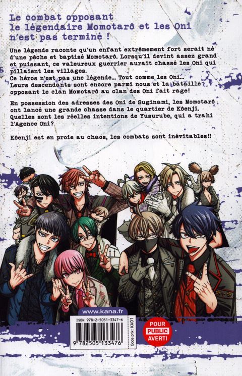 Une légende raconte qu’un enfant extrêmement fort serait né d’une pêche et baptisé Momotarô. Lorsqu’il devint assez grand et puissant, ce valeureux guerrier aurait chassé les Oni qui pillaient les villages.Ce héros n’est pas une légende… Tout comme les Oni…Leurs descendants sont encore parmi nous et la bataille opposant le clan Momotarô au clan des Oni fait rage !En possession des adresses des Oni de Suginami, les Momotarô ont lancé une grande chasse dans le quartier de Kôenji.Quelles sont les réelles intentions de Yusurube, qui a trahi l’Agence Oni ? Kôenji est en proie au chaos, les combats sont inévitables !!