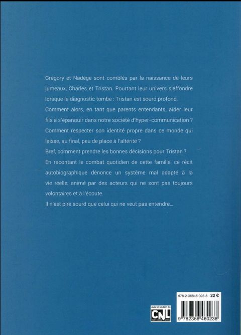Grégory et Nadège sont comblés par la naissance de leurs jumeaux, Charles et Tristan. Pourtant leur univers s’effondre lorsque le diagnostic tombe : Tristan est sourd profond. Comment alors, en tant que parents entendants, aider leur fils à s’épanouir dans notre société d’hyper-communication ? Comment respecter son identité propre dans ce monde qui laisse, au final, peu de place à l’altérité ? Bref, comment prendre les bonnes décisions pour Tristan ? En racontant le combat quotidien de cette famille, ce récit autobiographique dénonce un système mal adapté à la vie réelle, animé par des acteurs qui ne sont pas toujours volontaires et à l’écoute. Il n’est pire sourd que celui qui ne veut pas entendre…