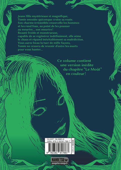 Jeune fille mystérieuse et magnifique, Tomie envoûte quiconque croise sa route. Son charme irrésistible ensorcelle les hommes et les rend fou, au point de les pousser au meurtre... son meurtre !Beauté froide et monstrueuse, capable de se regénérer indéfiniment, elle sème le chaos et répand inévitablement sa malédiction. Vous aurez beau la tuer de mille façons, Tomie ne cessera de revenir d'entre les morts pour vous hanter...