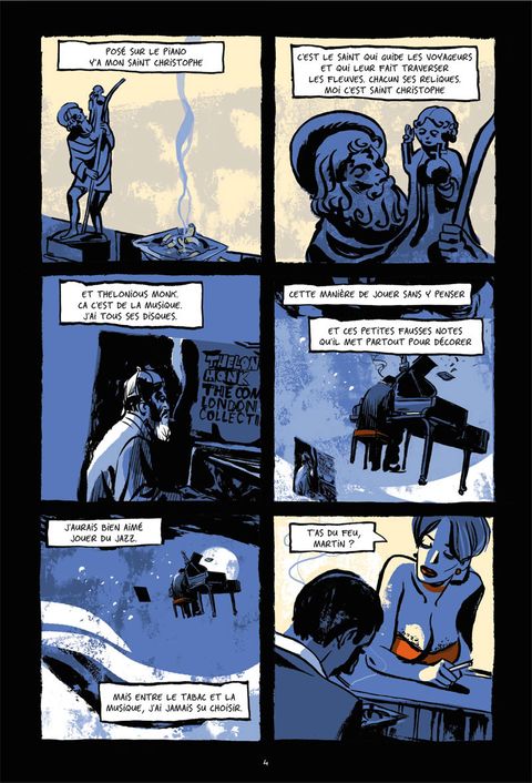 Quand un pianiste solitaire s'acoquine à une strip-teaseuse solaire... un road movie existentiel plein d'élégance et d'aventure, au graphisme remarquable... Martin est pianiste dans un bar à strip-tease. Un bon job, diront certains ! Si ce n'est que Martin est plus du genre à s'absorber dans ses feuilles de partitions et ses volutes de cigarettes que dans l'effeuillage fumeux des filles sur scène ! Ce qui convient parfaitement à Monsieur Frognard, le gérant de la boîte.Trop ravi que son pianiste ait plus les yeux sur son clavier que sur la symphonie de magouilles dont il est le chef d'orchestre... Jusqu'au jour où la sublime Jeanne, l'effeuilleuse vedette de la revue, propose à Martin de tout plaquer pour partir à l'aventure dans la DS du patron... Un pianiste lunaire. Une strip-teaseuse terre-à-terre. Un gros magot planqué dans le coffre de la DS. L'escapade romantique ne n'annonce pas des plus reposantes... Interprétée par Olivier Balez et Arnaud Le Gouefflec, Toplessest une balade en terres d'élégance et de polar sur un air de Theolonious Monk. Un road-movie tout à tour contemplatif et brûlant de sentiments contrastés. Une véritable réussite graphique et narrative.