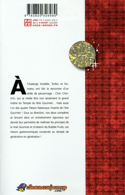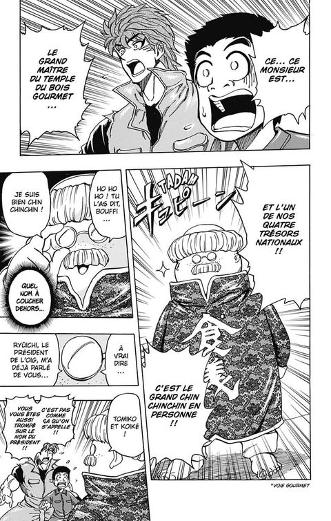 À l'auberge Invisible, Toriko et Komatsu ont fait la rencontre d'un drôle de personnage : Chin Chinchin, qui se révèle être non seulement le grand maître du Temple du Bois Gourmet... mais aussi l'un des quatre Trésors Nationaux Vivants de l'ère Gourmet ! Sous sa direction, nos deux compères se lancent dans un entraînement rigoureux qui devrait leur permettre de maîtriser les principes de la Voie Gourmet, et d'obtenir les Bubble Fruits, ces trésors gastronomiques conservés au temple de génération en génération !
