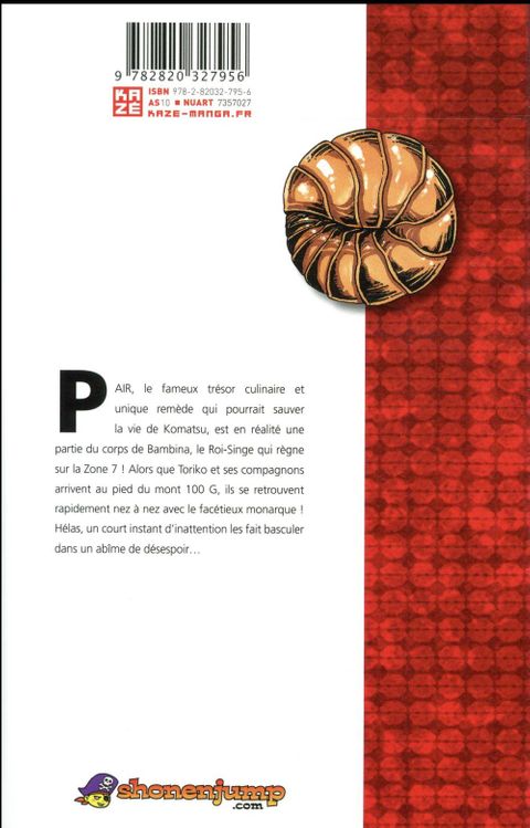 PAIR, le fameux trésor culinaire et (l')unique remède qui pourrait sauver la vie de Komatsu, est en réalité une partie du corps de Bambina, le Roi-Singe qui règne sur la Zone 7 ! Alors que Toriko et ses compagnons arrivent au pied du mont 100 G, ils se retrouvent rapidement nez à nez avec le facétieux monarque ! Hélas, un court instant d'inattention les fait basculer dans un abîme de désespoir...