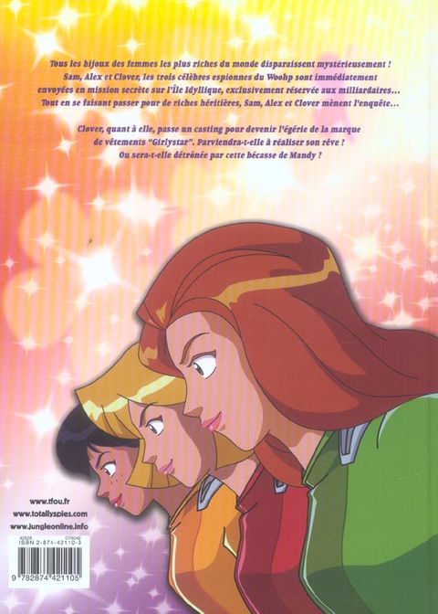 Dans le premier épisode de Totally Spies en BD, Clover, sam et Alex sont appelées par Jerry au QG. Les femmes les plus riches du monde se sont faites cambrioler ! Tous leurs bijoux ont mystérieusement disparus... Et cela, peu de temps après avoir passé des vacances dans un palace, sur l'île... Idyllique...Les 3 filles partent enquêter sur l'île pour y résoudre l'énigme. Parallèlement à cette intrigue, le lecteur découvre des éléments inédits sur la vie privée des 3 héroïnes.