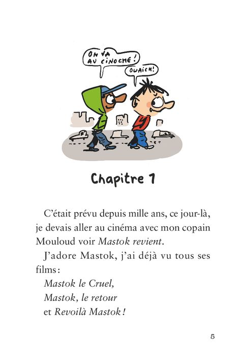 Ce jour-là, je devais aller au cinéma avec mon copain Mouloud voir Mastok revient. Mais c'était sans compter sur Zara et ses boutons plein la figure ! À cause d'elle, mes parents nous ont envoyés passer la fin des vacances chez Mémé Coco, là où il n'y a pas un cinéma à mille kilomètres à la ronde... C'est pas juste !