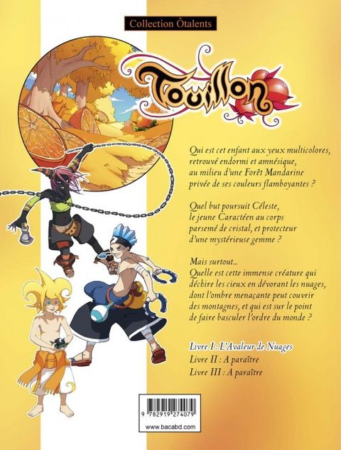 Qui est cet enfant aux yeux multicolores, retrouvé endormi et amnésique, au milieu d’une Forêt Mandarine privée de ses couleurs flamboyantes ? Quel but poursuit Céleste, le jeune Caractéen au corps parsemé de cristaux ? Et quelle est cette gemme qu’il protège tant ? Arriveront-ils à temps dans le désert du Shalabou ? Survivront-ils à tous les dangers qui se dresseront sur leur route ? Mais surtout : d’où vient cette immense créature qui déchire les cieux en dévorant les nuages, dont l’ombre menaçante peut couvrir des montagnes, et qui est sur le point de faire basculer l’ordre du monde ?