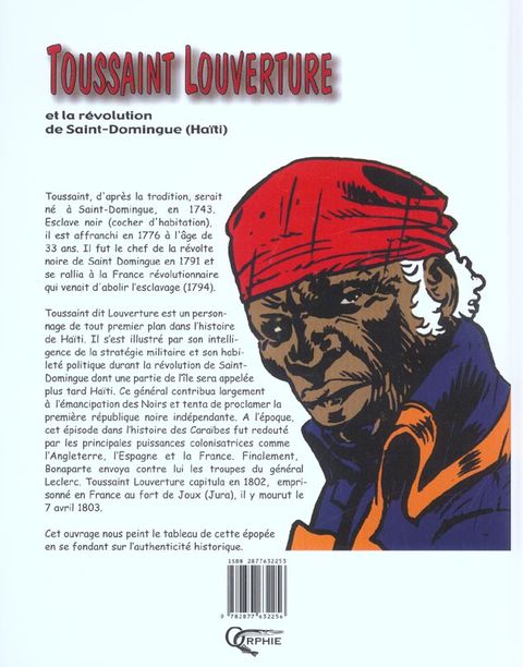 Toussaint, d'après la tradition, serait né à Saint-Domingue, en 1743. Esclave noir (cocher d'habitation), il est affranchi en 1776 à l'âge de 33 ans. Il fut le chef de la révolte noire de Saint-Domingue en 1791 et se rallia à la France révolutionnaire qui venait d'abolir l'esclavage (1794). Toussaint dit Louverture est un personnage de tout premier plan dans l'histoire de Haïti. Il s'est illustré par son intelligence de la stratégie militaire et son habileté politique durant la révolution de Saint-Domingue dont une partie de l'île sera appelée plus tard Haïti. Ce général contribua largement à l'émancipation des Noirs et tenta de proclamer la première république noire indépendante. A l'époque, cet épisode dans l'histoire des Caraïbes fut redouté par les principales puissances colonisatrices comme l'Angleterre, l'Espagne et la France. Finalement Bonaparte envoya contre lui les troupes du général Leclerc. Toussaint Louverture capitula en 1802, emprisonné en France au fort de Joux (Jura), il y mourut le 7 avril 1803. Cet ouvrage nous peint le tableau de cette épopée en se fondant sur l'authenticité historique.