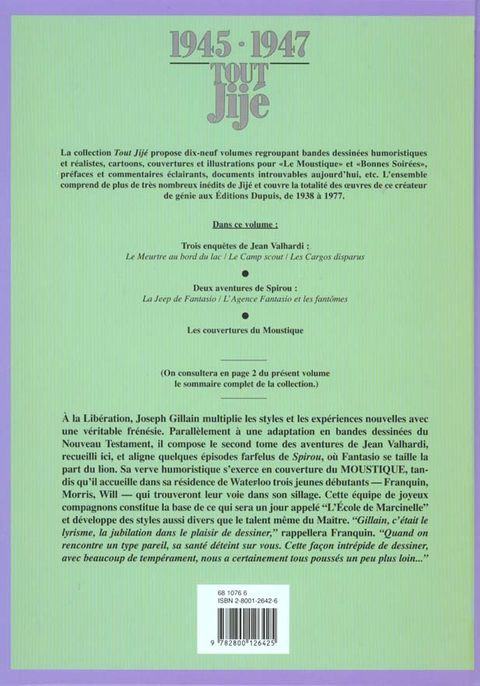 A la Libération, Joseph Gillain multiplie les styles et les expériences nouvelles avec une véritable frénésie. Parallèlement à une adaptation en bandes dessinées du Nouveau Testament, il compose le second tome des aventures de Jean Valhardi, recueilli ici, et aligne quelques épisodes farfelus de Spirou, où Fantasio se taille la part du lion. Sa verve humoristique s'exerce en couverture du MOUSTIQUE, tandis qu'il accueille dans sa résidence de Waterloo trois jeunes débutants - Franquin, Morris, Will - qui trouveront leur voie dans son sillage. Cette équipe de joyeux compagnons constitue la base de ce qui sera un jour appelé "L'Ecole de Marcinelle" et développe des styles aussi divers que le talent même du Maître. "Gillain, c'était le lyrisme, la jubilation dans le plaisir de dessiner," rappellera Franquin. "Quand on rencontre un type pareil, sa santé déteint sur vous. Cette façon intrépide de dessiner, avec beaucoup de tempérament, nous a certainement tous poussés un peu plus loin..."