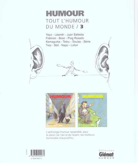 Les meilleurs dessinateurs et humoristes d'aujourd'hui sont réunis dans les anthologies Tout l'humour du monde dont voici déjà le troisième volume. Ces albums sont consacrés à l'humour sous toutes ses formes et vous offrent à chaque fois de 80 pages de bonheur absolu où alternent séries de dessins d'humour et textes humoristiques. Dans ce troisième et nouvel album vous retrouverez de grandes signatures du monde entier, par exemple : Bosc, Puig-Rosado, Yayo, Böll, Kamagurka, Juan Ballesta, Trez, Soulas pour des dessins savoureux. La partie textes sera également assurée par de très grands noms dont Philippe Héraclès (Joyeuses épitaphes). Cette anthologie vient compléter la collection Glénat Humour qui publie les meilleurs humoristes de notre époque comme Serre, Quino, Mordillo, Pessin, Blachon, François Rollin, Lefred-Thouron, Lécroart, Glück, Kamagurka, Cambon ou Maja, et qui rencontre un très beau succès tant public que critique.