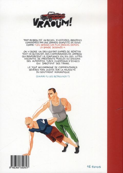 Ce livre devait s'appeler TOUT ou s'appeler RIEN... il aurait aussi pu s'appeler LE MONDE DE GEOFFROY MONDE, finalement, ce sera TOUT OU RIEN, à savoir un recueil des histoires les plus farfelues de Geoffroy Monde, un auteur qui est l'héritier direct de Thierry Goossens, tant au niveau du dessin que de l'esprit. Dans ce recueil, on retrouvera quelques aventures de SERGE ET DEMI-SERGE, on verra Dieu en personne descendre sur terre pour annoncer les promotions au supermarché, on verra Daniel Auteuil avec des ailes, on découvrira comment une banque en mal de popularité va redorer son blason en embauchant un crabe... Toute une série d'histoires qu'on a pu découvrir dans des collectifs, mais aussi sur le net entre le blog de Geoffroy Monde ou ses participations à la revue participative VENTS CONTRAIRES. Le dessin rond et l'esprit biscornu de Geoffroy Monde sont une rafraichissante nouveauté dans la bande dessinée d'humour. Pour tous ceux qui aiment l'humour absurde, la surprise et les histoires décalées. Le premier livre publié d'un auteur à suivre. Ce livre propose une sélection des meilleurs dessins de l'année passée, agrémentés de quelques guest pour l'occasion.