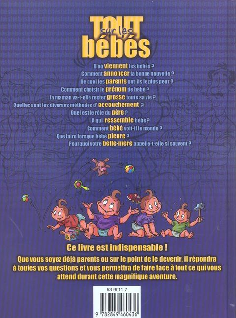 D'oú viennent les bébés ? comment annoncer la bonne nouvelle ? de quoi les parents ont-ils le plus peur ? comment choisir le prénom de bébé ? la maman va-t-elle rester grosse toute sa vie ? quelles sont les diverses méthodes d'accouchement ? quel est le rôle du père ? a qui ressemble bébé ? comment bébé voit-il le monde ? que faire lorsque bébé pleure ? pourquoi votre belle-mère appelle-t-elle si souvent ? ce livre est indispensable ! que vous soyez déjà parents ou sur le point de le devenir, il répondra à toutes vos questions et vous permettra de faire face à tout ce qui vous attend durant cette magnifique aventure.