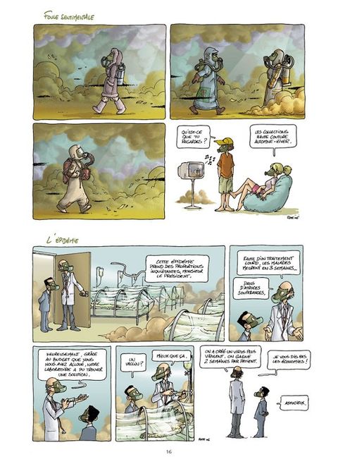 Avec un dessin simple et efficace, et un humour aussi décapant qu'une molécule de synthèse, l'album Toxic Planet fait rire jaune fluo. C'est un monde où les cauchemars sont des balades bucoliques, où les subversifs ont des poumons encore sains et où les trouillards n'osent pas se défaire de leur masque à gaz, le temps d'un câlin.
