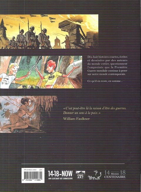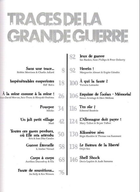 L'édition de cette oeuvre collective résulte d'un partenariat de longue date avec la Mission Centenaire de la Grande Guerre, en cours depuis 2014. Une nouvelle fois, la bande dessinée prouve qu'elle est un formidable médium pour faire revivre ce qui n'est plus, évoquer, faire ressentir et réfléchir... Dans Traces de la Grande Guerre, 38 auteurs du monde entier, formant parfois des duos inédits, abordent ce qu'il reste du conflit dans nos esprits, nos politiques, notre science, nos paysages, nos peurs, etc. Résolumment tournée vers le présent et l'avenir, chaque histoire propose un angle personnel, graphiquement et thématiquement. L'ouvrage sortira simultanément en France et dans les pays anglophones et sera porté par des outils de médiation dédiés (exposition, fiches pédagogiques, site Web dédié, etc.).