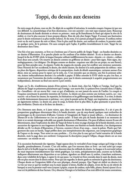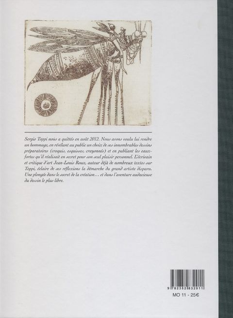 Sergio Toppi nous a quitté en août 2012, nous avons voulu lui rendre un hommage en révélant au public un choix de ses innombrables esquisses et crayonnés et en publiant les eaux-fortes qu'il réalisait en vacances pour son propre plaisir personnel. L'écrivain et poète Jean-Louis Roux éclaire de ses réflexions la démarche du grand artiste disparu.