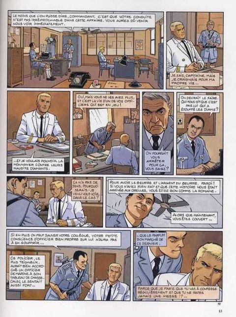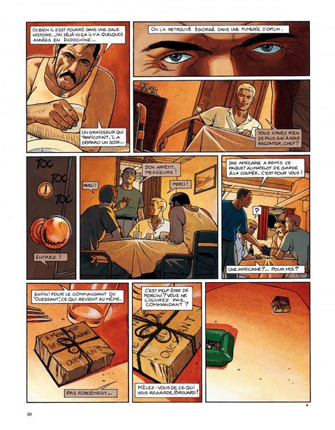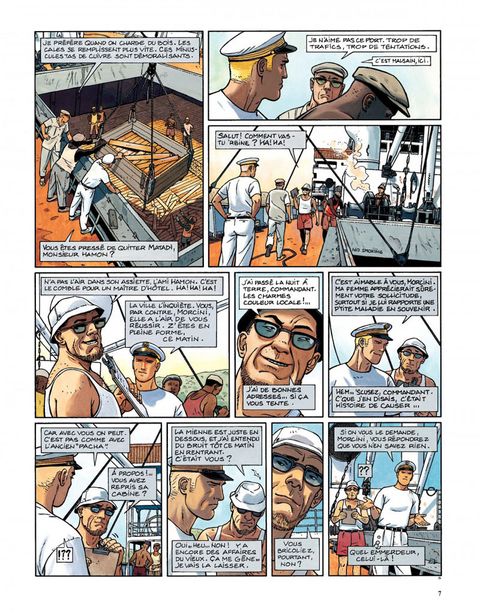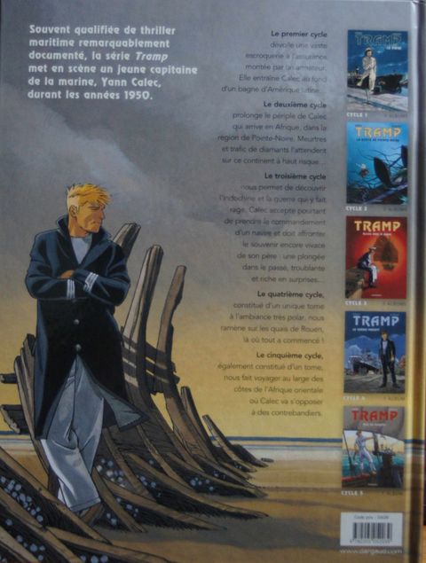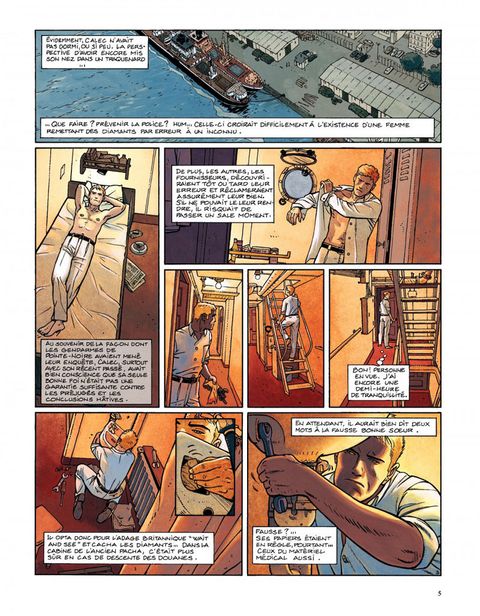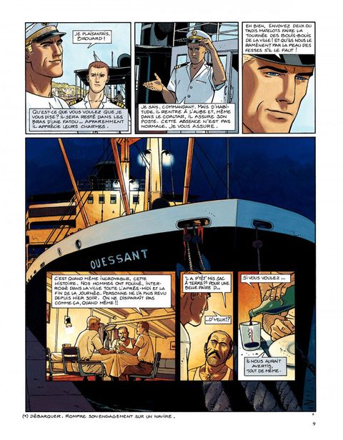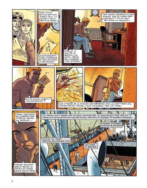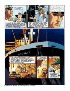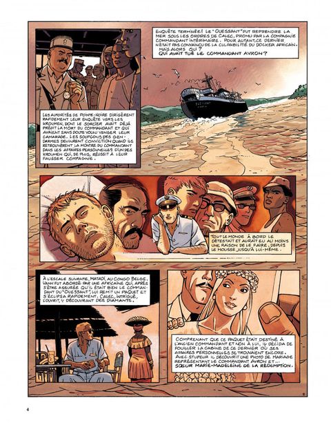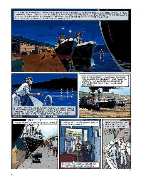 Résumé du dernier épisode : sorti du piège de la Belle-Hélène (et du premier cycle de ses aventures), Yann Calec se retrouve second sur le Ouessant, dont le commandant, Avron, est assassiné. La police arrête rapidement le coupable idéal, un docker noir, mais Calec juge cette conclusion un peu hâtive. Tout le monde pouvait tuer Avron, car tout le monde à bord le détestait, et deux détails restent obscurs. Le bref passage à bord de soeur Marie-Madeleine de la Rédemption, et la disparition du chat du mousse la nuit du meurtre ! Promu commandant intérimaire du Ouessant, Calec reprend la mer. A la première escale, une Africaine lui apporte un paquet contenant des diamants. Le paquet étant destiné à Avron, Calec fouille sa cabine pour en savoir plus, et y trouve une photo de mariage représentant Avron et soeur Marie-Madeleine. Décidément, ça sent l'embrouille ! Calec aimerait bien dire deux mots à cette fausse bonne soeur qui, le jour du meurtre, a quitté le cargo pour soi-disant se rendre dans une mission catholique, la mission de Kibangou. Peu après, Calec reçoit un autre paquet, plus macabre ? il contient un doigt de son lieutenant subitement disparu, et une lettre menaçant de lui expédier le reste par petits bouts s'il ne rend pas les diamants. Calec ne peut plus rendre les diamants qu'il avait cachés et qui lui ont été volés. Il se résout donc à aller voir la police locale, qui, une fois de plus, boucle l'affaire un peu vite en concluant à un règlement de comptes entre trafiquants. Calec n'y croit pas. Quelques diamants dans un paquet de clopes vide ne constituent pas à ses yeux un vrai trafic, il continue l'enquête. Il découvrira la vérité à Kibangou, vérité dans laquelle... le chat avait un rôle. Dans la nuit des ports, sous le soleil du Congo, une aventure torride ? avec ce qu'il faut de danger, de suspense, d'humour et de sales types ? servie par un dessin lumineux et expressif. Calec, réembarqué sur le Ouessant et très désireux de revoir Rosana et Iñès, leur petite fille, vient de tracer sur la carte "la route de Rouen". Une suite aura donc bien lieu, en l'occurrence avec un cycle qui se déroulera en Asie.